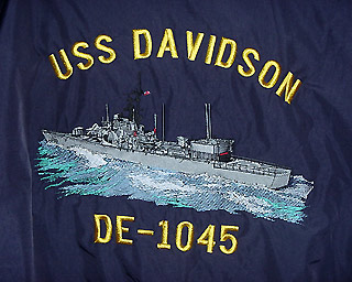 Michael Martucci brought gifts for all from New York . One of my treasures is a Mustang T-Shirt. Another of Michael items on display at the reunion was a work of art in embroidery…………a USS DAVIDSON blue nylon jacket with the ship embroidered on the back in color with incredible detail, along with the American flag on the shoulder, and name on the front. What a treasure to behold there.